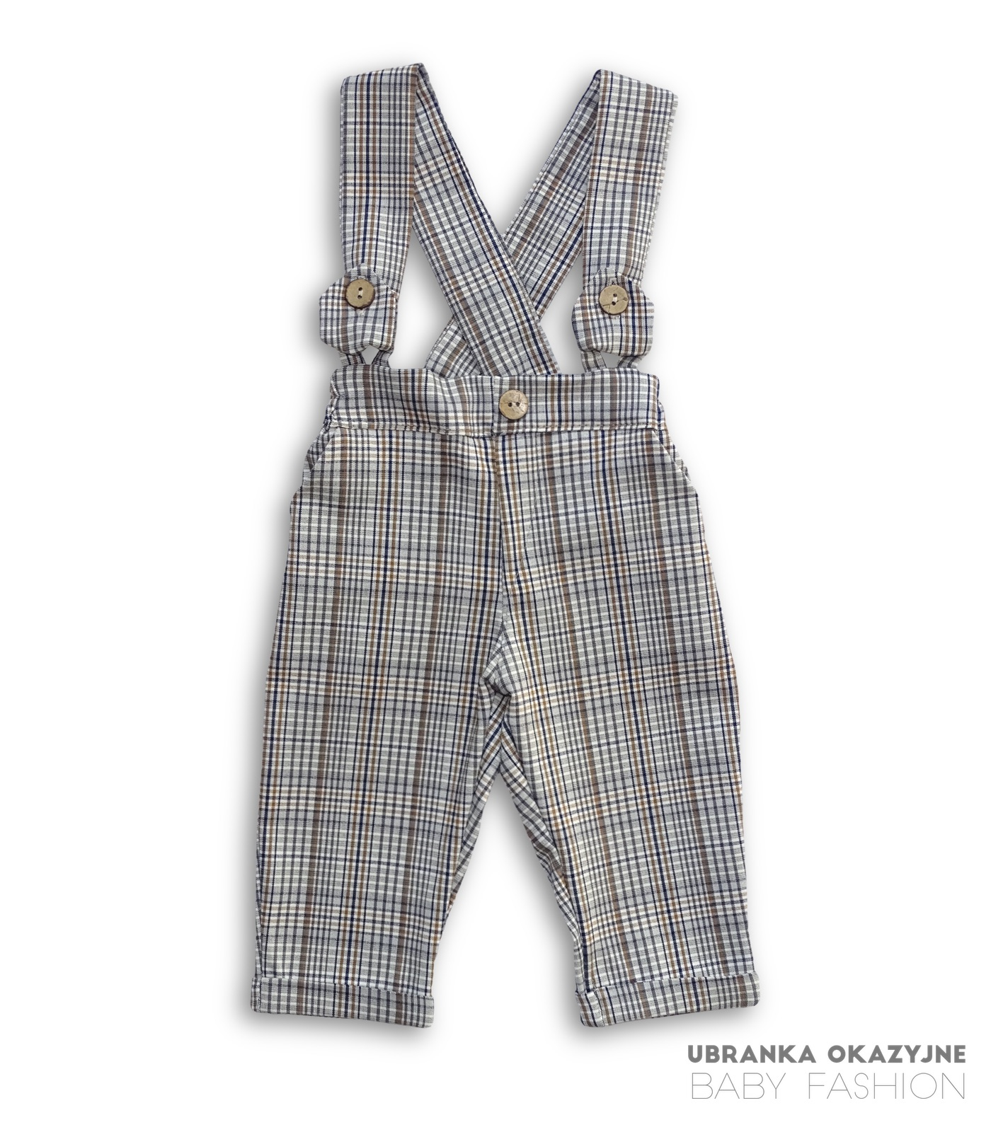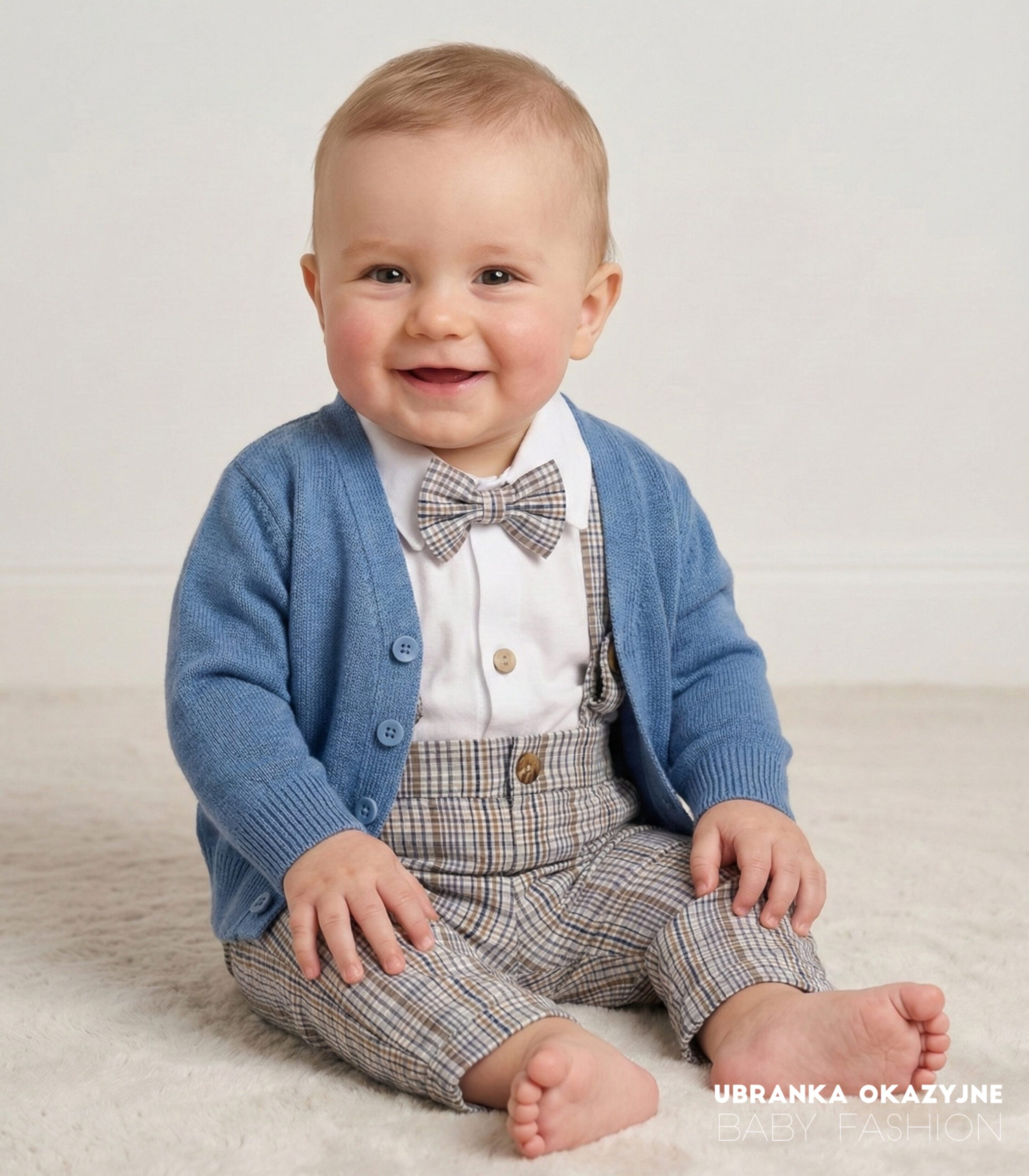 Spodnie na szelkach w beżową kratkę nie tylko dodają uroku, ale także zapewniają wygodę ruchu dla maluszka. Białe koszulo-body z drewnianymi guziczkami zapewniają elegancję i wygodę noszenia. Muszka idealnie komponuje się z kolorem spodni, dodając całości uroku i klasy. Sweter w atramentowym kolorze nadaje całości wyjątkowego charakteru i podkreśla elegancję zestawu.
