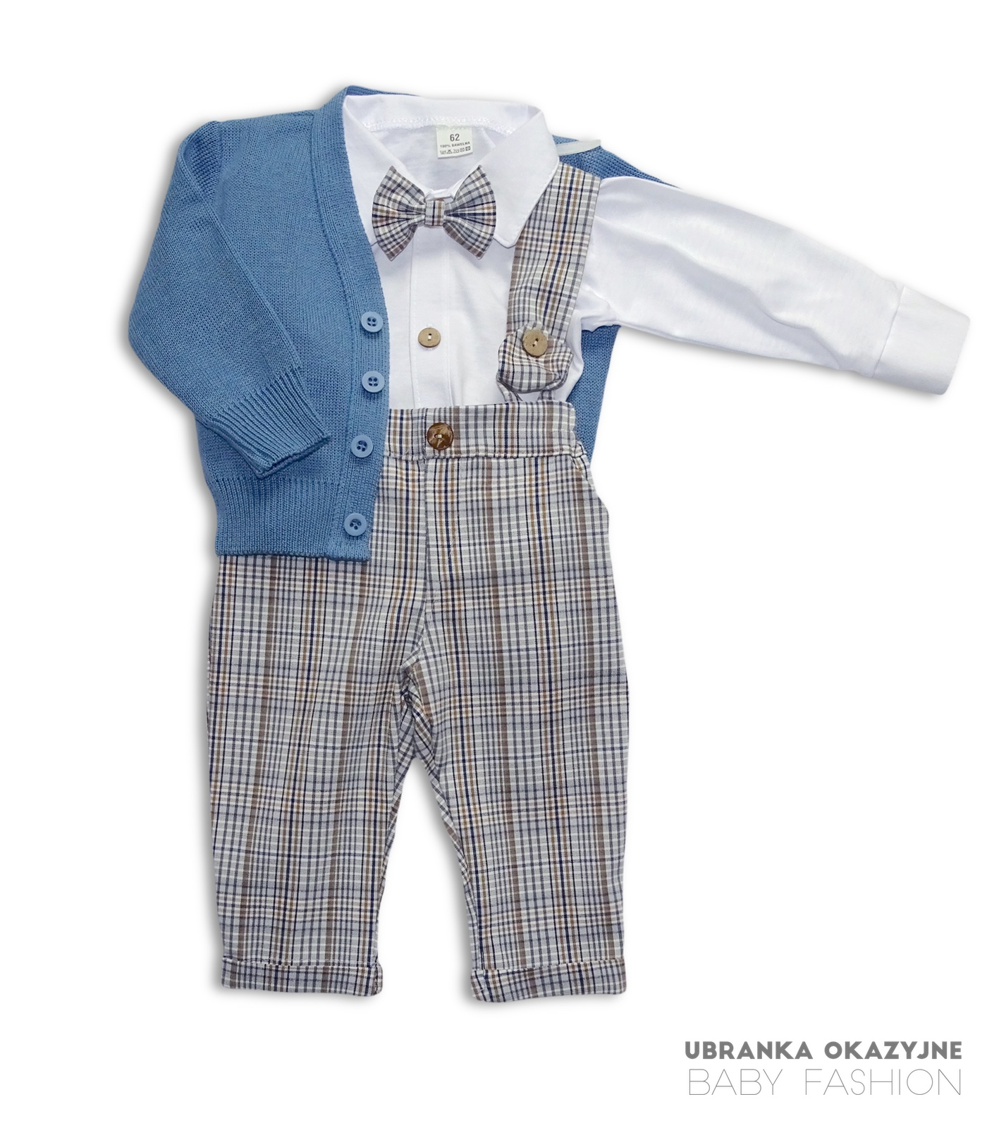 Zestaw dla małego stylowca to urokliwe spodnie na szelkach w beżową kratkę, białe bawełniane koszulo-body z długim rękawem zdobione drewnianymi guziczkami, atramentowy gładki sweterek oraz elegancka mucha w tonacji spodni. Każda część tego zestawu jest starannie uszyta w Polsce, dbając o najwyższą jakość wykonania. Daj swojemu dziecku szansę na wyrażenie swego stylu w wygodnym, designerskim ubranku. Zestaw idealnie sprawdzi się jako ubranko do chrztu jak i na imprezy okolicznościowe. Dostępne rozmiary : 62 , 68 , 74 , 80 , 86.