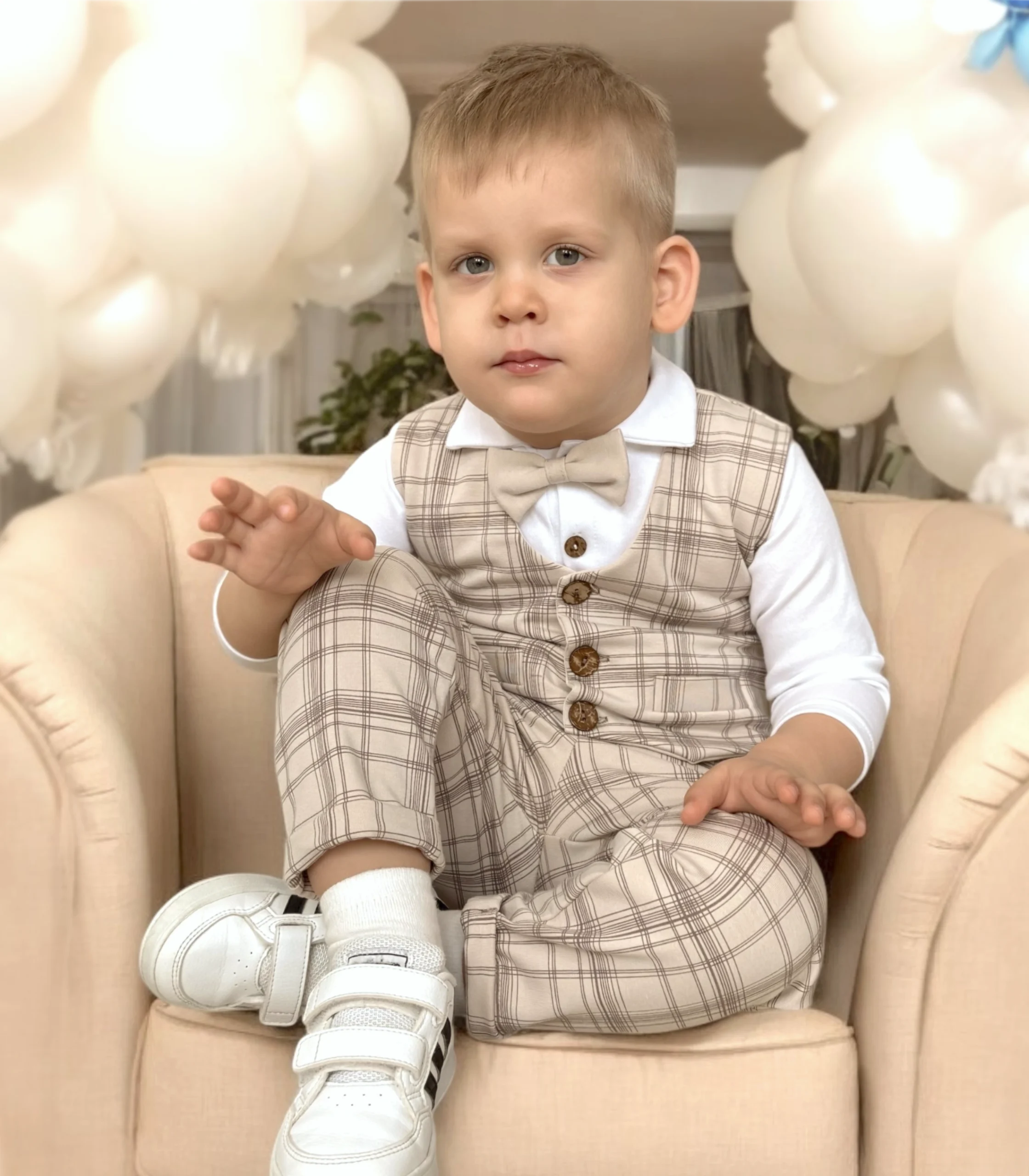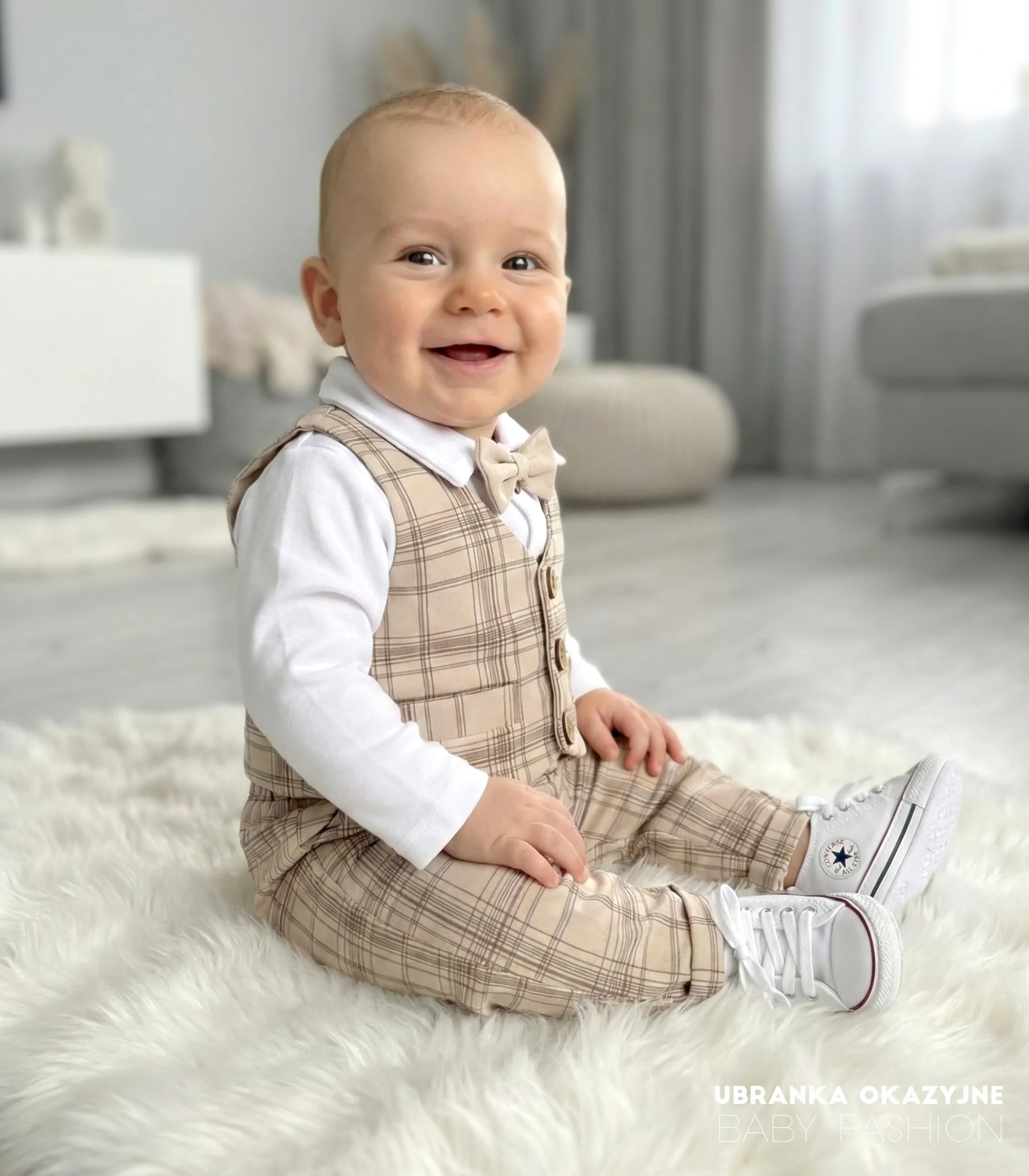Szukasz wyjątkowego stroju dla swojego malucha? Nasz elegancki zestaw dla niemowlaka lub małego dziecka to idealne połączenie stylu, wygody i najwyższej jakości wykonania. Składa się z beżowych spodni, kamizelki w brązową kratkę, białego body z brązowymi guziczkami oraz uroczej beżowej muszki, tworząc niezwykle gustowną i elegancką całość.