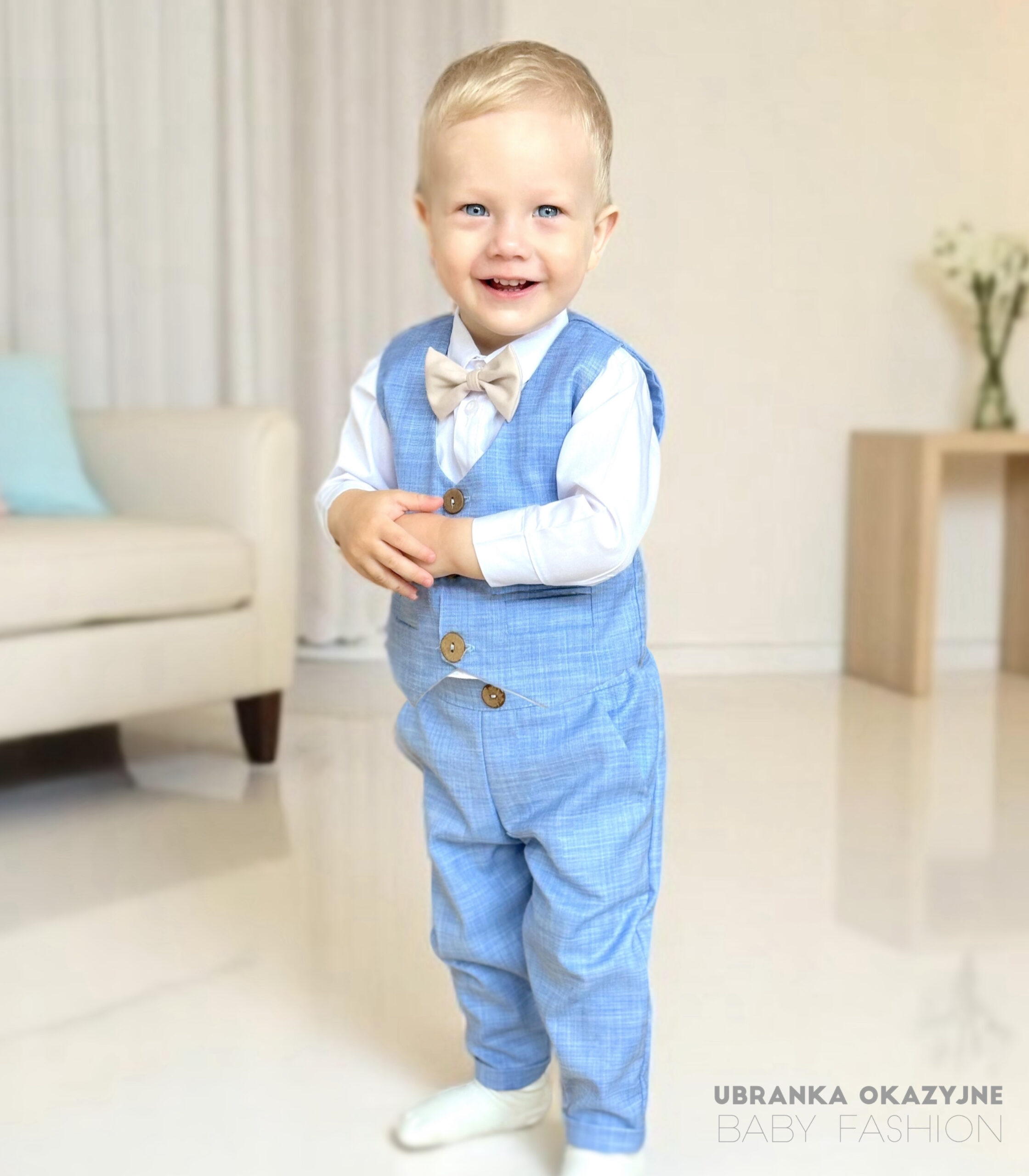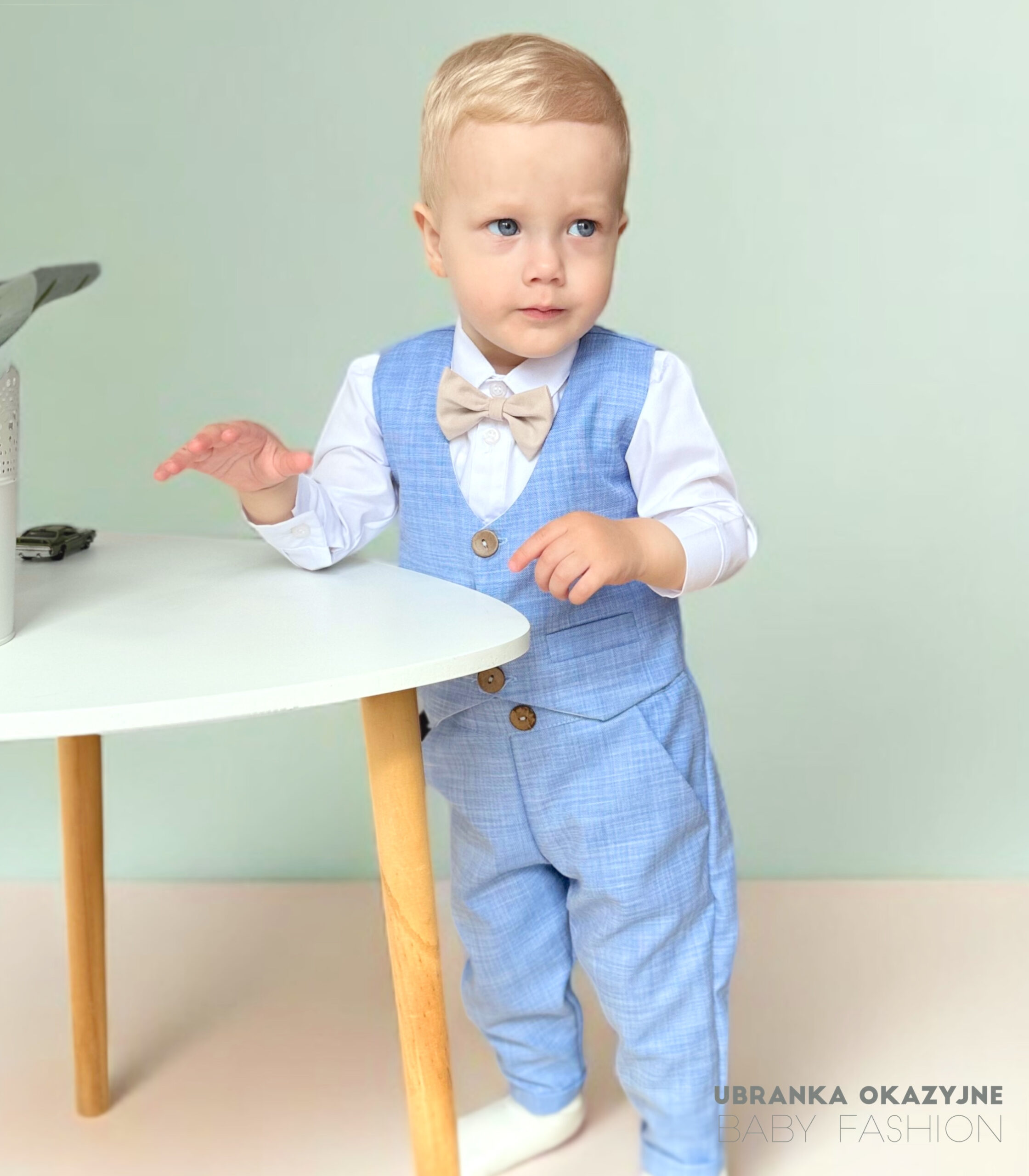 Błękitna kamizelka zapinana na 3 drewniane guziczki oraz muszka w kolorze beżowym nadają całości eleganckiego charakteru.