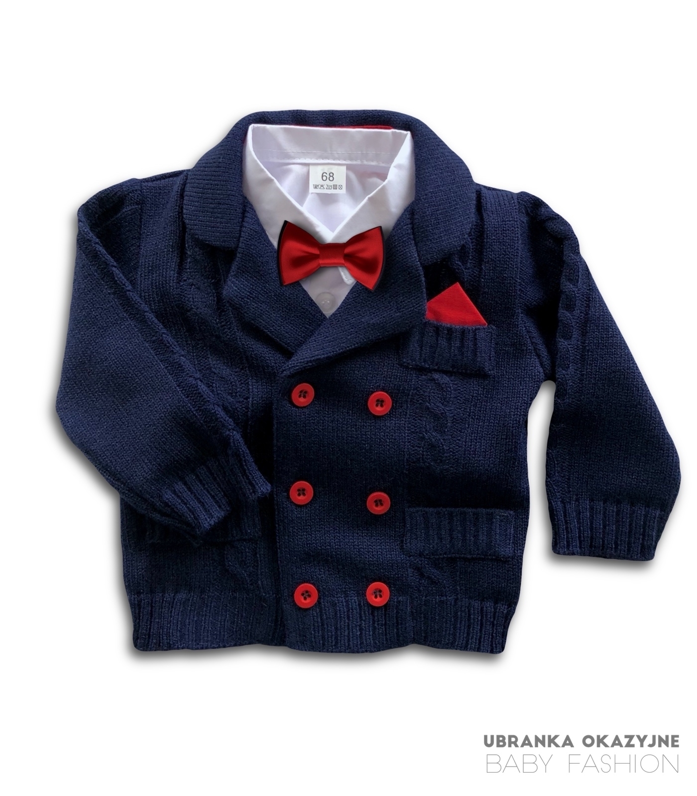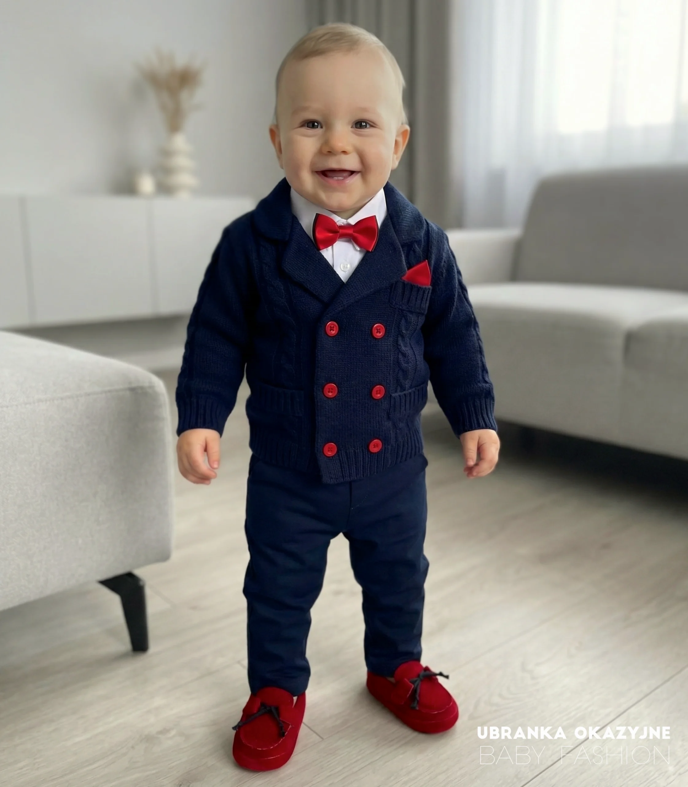 Wykreuj wyjątkowy styl dla Twojego maluszka dzięki naszemu zestawowi! Zestaw zawiera granatowy dwurzędowy sweterek ozdobiony uroczymi czerwonymi guziczkami, białe koszulo-body z długim rękawem oraz granatowe klasyczne spodnie typu rurki z tkaniny ciągliwej z gumką w pasie dla większego komfortu. Dodatkowo w zestawie znajduje się muszka w kolorze czerwono-granatowym. Dostępne rozmiary: 62, 68, 74, 80, 86. Nasz zestaw nie tylko zapewni wygodę Twojemu dziecku, ale także pozwoli mu wyrazić swój niepowtarzalny styl. Odkryj naszą ofertę już teraz i podaruj swojemu maluchowi elegancki look na każdą okazję!