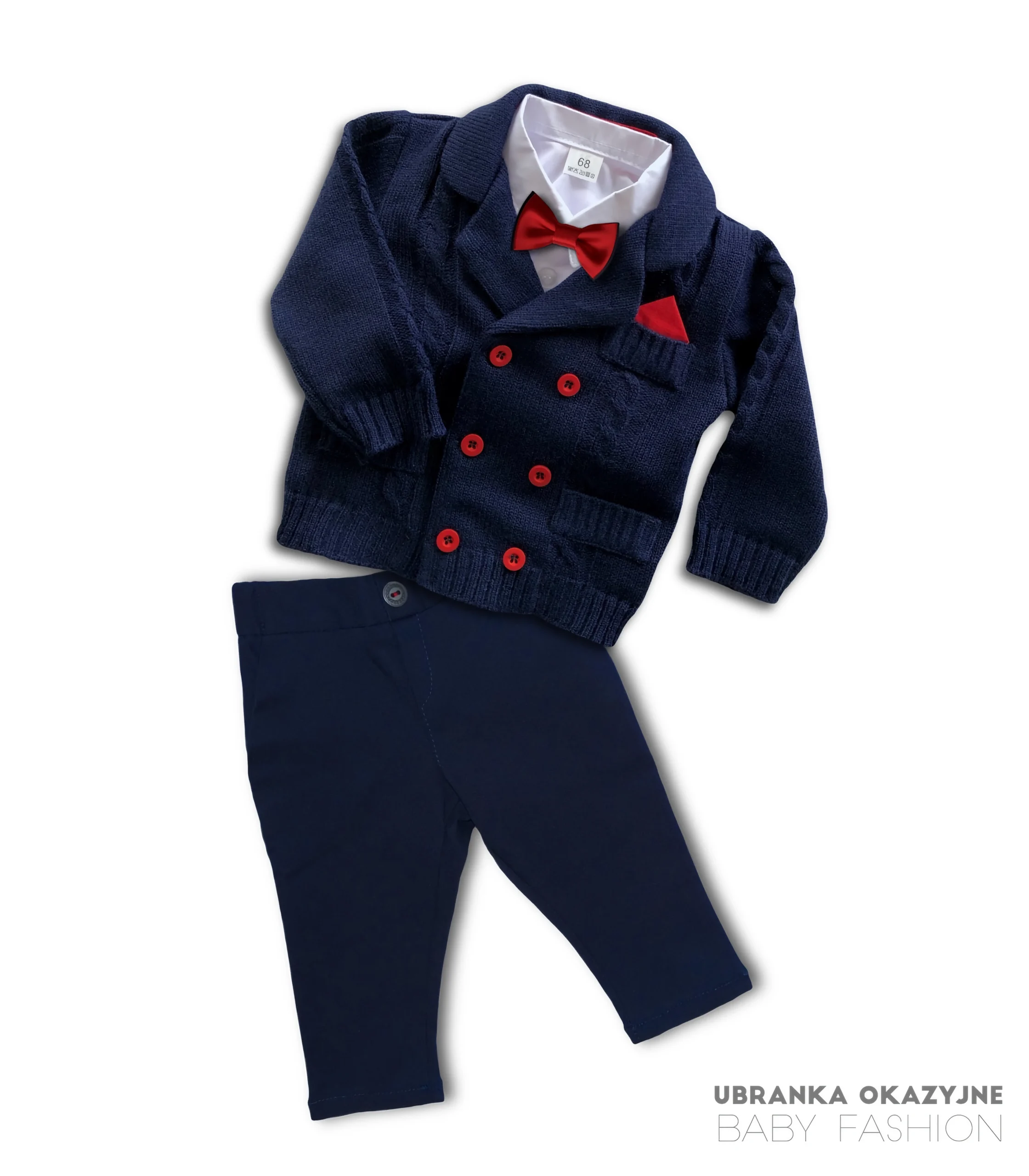 Zestaw dla małego eleganta to granatowe spodnie typu rurki z ciągliwej tkaniny z gumką w pasie. Do tego białe koszulo-body z długim rękawem, czerwono-granatowa mucha oraz elegancki granatowy sweterek w formie marynarki z czerwonymi guziczkami. Każda część tego stylowego zestawu jest starannie uszyta w Polsce, gwarantując najwyższą jakość wykonania. Pozwól dziecku wyrazić swój unikalny styl. Idealne ubranko do chrztu jak i na imprezy okolicznościowe.