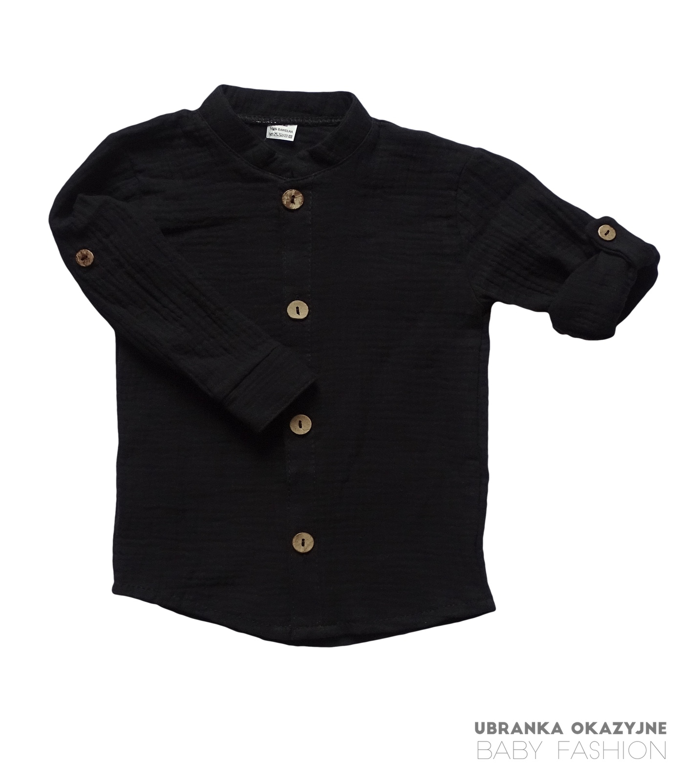 Czarna koszula muślinowa jest nie tylko stylowa, ale także wyjątkowo miękka i delikatna dla delikatnej skóry dziecka. Długie rękawy zapewniają ciepło w chłodniejsze dni, a drewniane guziczki dodają elegancji i uroku.