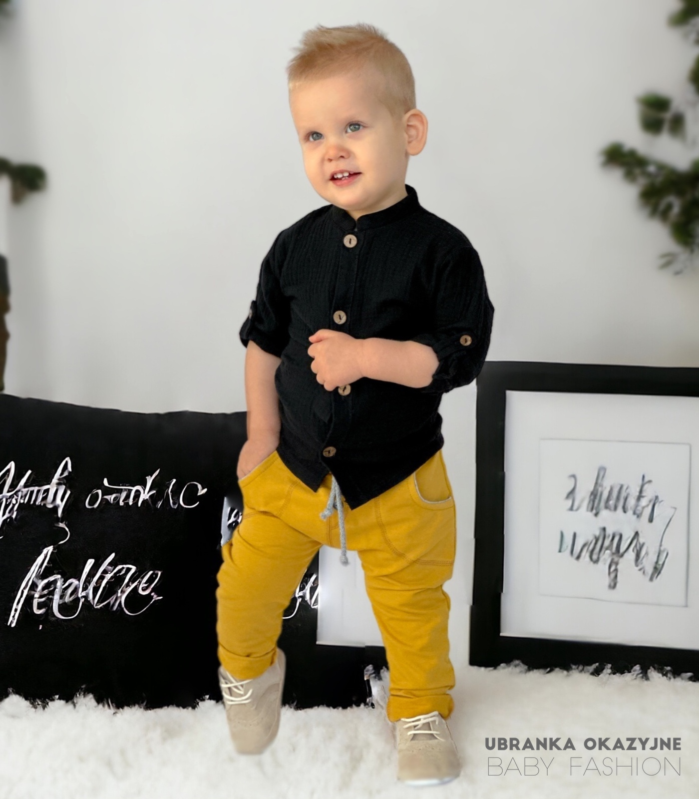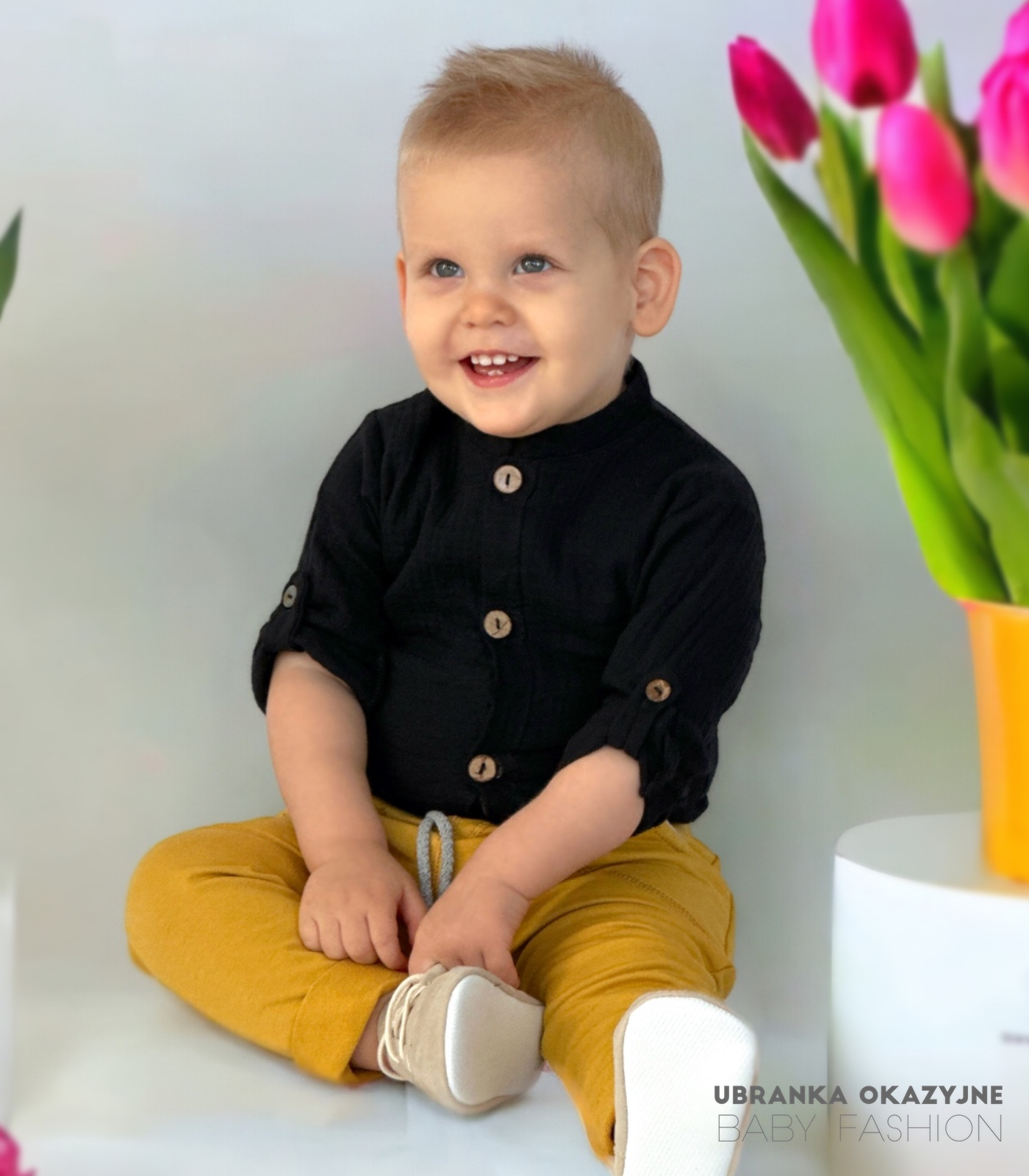 Czarna koszula muślinowa z długim rękawem dla małego dziecka lub niemowlaka to doskonały wybór na wiele okazji. – Koszula jest zapinana na drewniane guziczki, co dodaje uroku i naturalnego wyglądu. – Bawełniane spodnie w kolorze musztardowym świetnie komponują się z koszulą, tworząc elegancki zestaw. Dostępne rozmiary: 68, 74, 80, 86, pozwalają dopasować ubranie do rozmiaru Twojego maluszka, zapewniając mu wygodę i styl. Ten stylowy i wygodny zestaw sprawi, że Twoje dziecko będzie prezentować się uroczo i modnie zarówno na specjalne okazje, jak i na co dzień.
