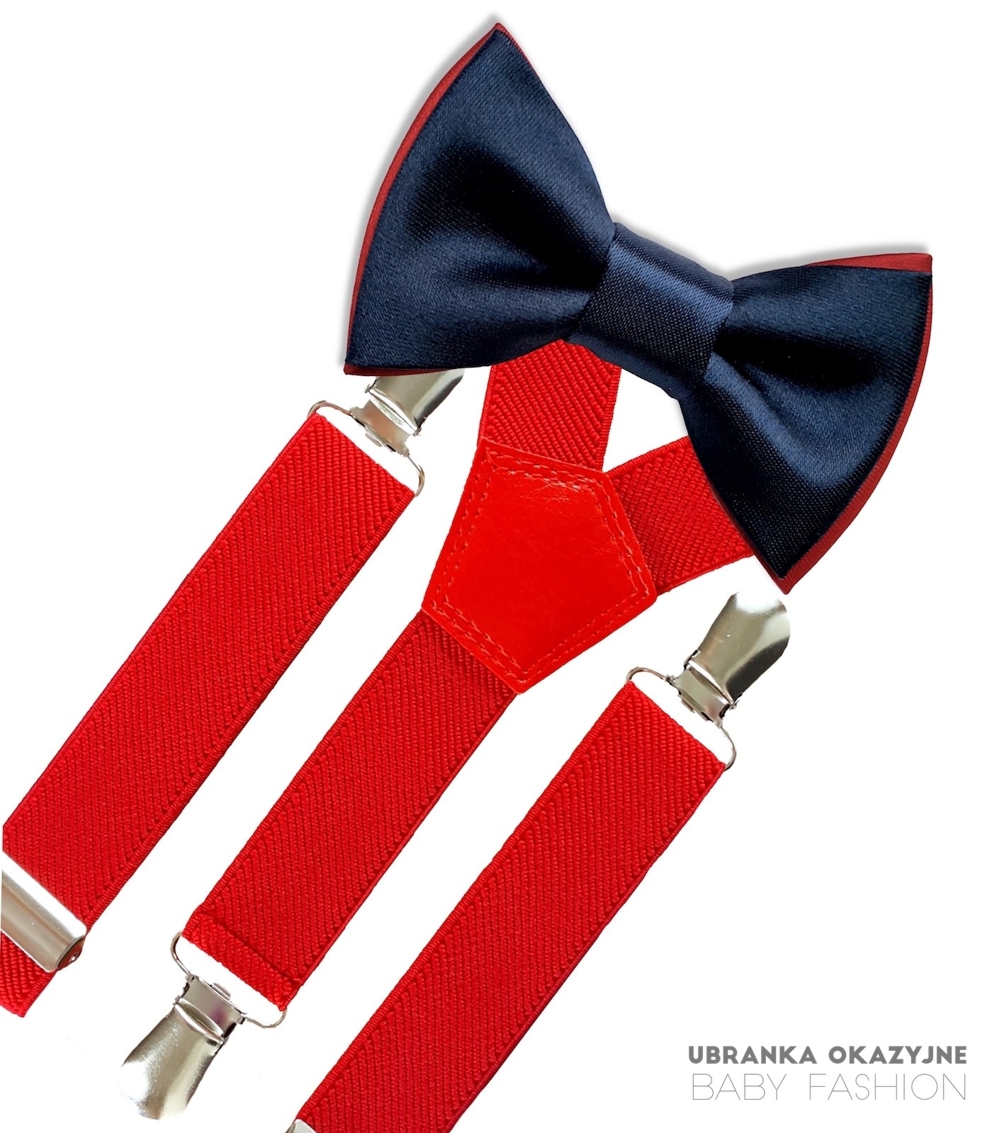 Zestaw czerwonych szelek i muszki w eleganckim kolorze granatowo-czerwonym, dedykowany niemowlakom oraz małym dzieciom. Szelki z regulacją od 0 do 3 lat zapewniają idealne dopasowanie, podobnie jak muszka na tasiemce z regulacją. Doskonałe jako dodatki do eleganckiego ubranka na chrzest lub imprezy okolicznościowe. Produkowane przez polskiego producenta, który gwarantuje wysoką jakość i styl.