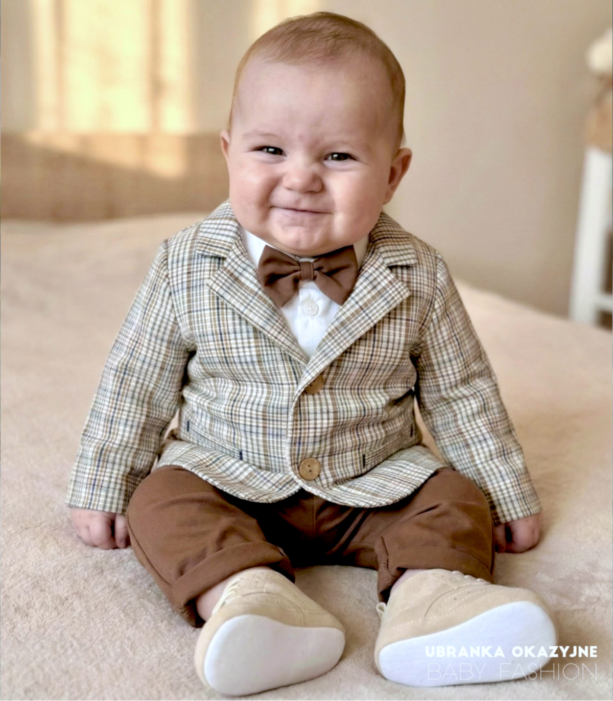 Odkryj elegancję w każdym detalu z naszym wyjątkowym garniturkiem do chrztu dla dziecka. Składający się z beżowej marynarki w kratę oraz spodni w kolorze czekoladowym, uzupełniony białym koszulo-body i czekoladową muchą. Ten polski produkt nie tylko emanuje stylem, ale także zapewnia najmłodszym wygodę podczas ważnego wydarzenia. Podaruj swojemu maluchowi niepowtarzalny wygląd z naszym eleganckim garniturkiem do chrztu.