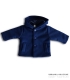 Granatowa kurtka ocieplana z kapturem zapinana na guziczki.