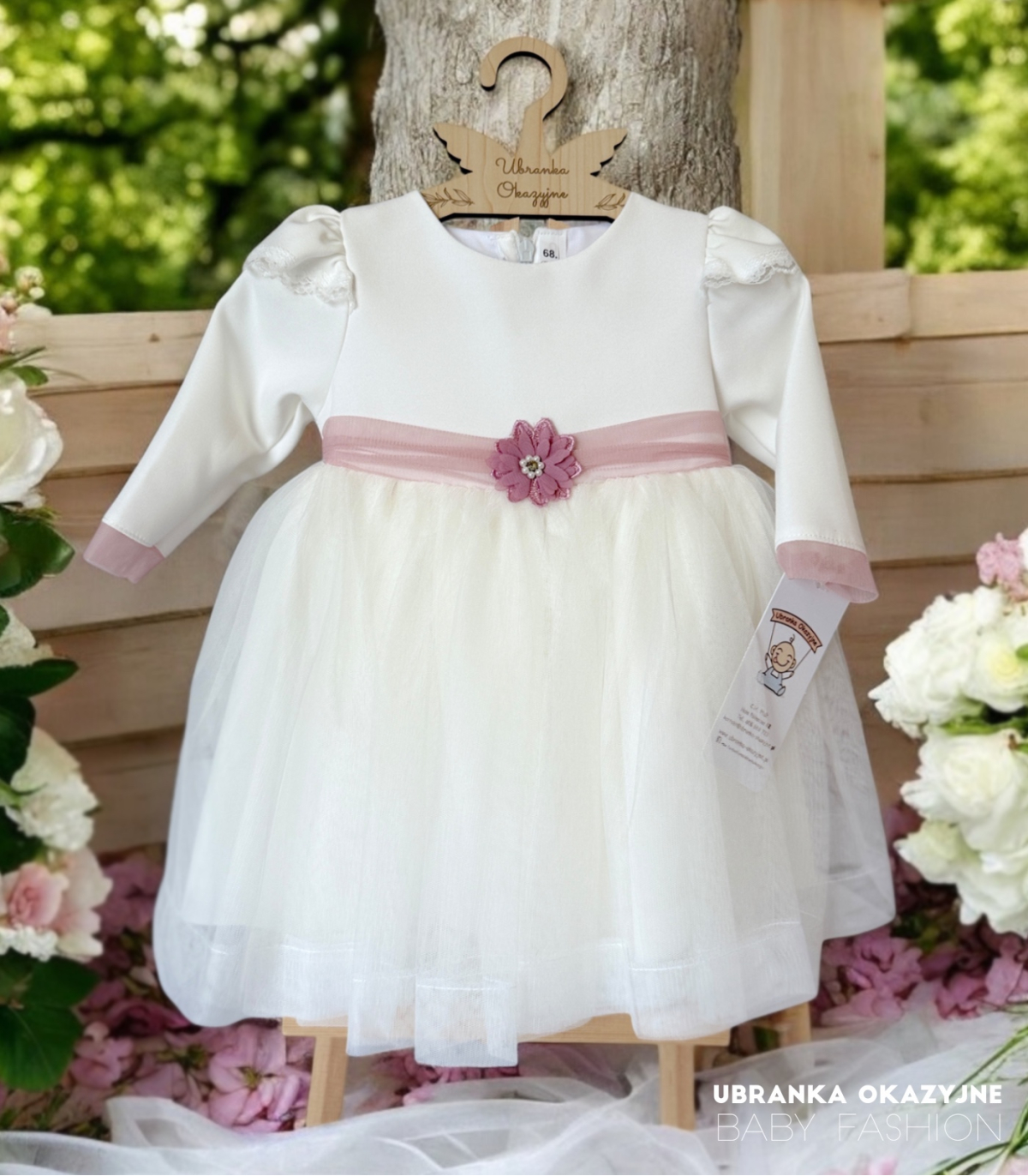 Wyjątkowa sukienka na chrzest to połączenie elegancji i delikatności. Ta niezwykła sukienka w kolorze ecru to idealny wybór na chrzest dla Twojej małej księżniczki. Delikatność i elegancja to jej główne cechy, które podkreślają wyjątkowość tego dnia. Długi rękaw zapewnia ciepło i wygodę, a gładka i miękka tkanina górnej części nadaje sukience subtelnego uroku. Dolna część sukienki wykonana z miękkiego tiulu gwarantuje lekkość i swobodę ruchów. Ozdobny pasek z kwiatkiem w kolorze fioletowym dodaje uroku i podkreśla talię. Sukienka dostępna jest w rozmiarach 62, 68 , 74 i 80, co pozwala na idealne dopasowanie dla każdej małej księżniczki. Produkt pochodzi od renomowanego polskiego producenta, co gwarantuje wysoką jakość i dbałość o detale. Uczyń ten wyjątkowy dzień jeszcze piękniejszym dzięki naszej niepowtarzalnej sukience na chrzest!