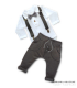 Zestaw dla małego eleganta to szare spodnie z bawełny, ozdobione metalowymi guziczkami i szarym sznurkiem w pasie. Do tego białe body z kołnierzykiem z drewnianymi guziczkami, oraz elegancka mucha w kolorze szarym we wzorki i szare szelki. Każda część tego stylowego zestawu jest starannie uszyta w Polsce, gwarantując najwyższą jakość wykonania. Pozwól dziecku wyrazić swój unikalny styl. Idealne ubranko do chrztu jak i na imprezy okolicznościowe.
