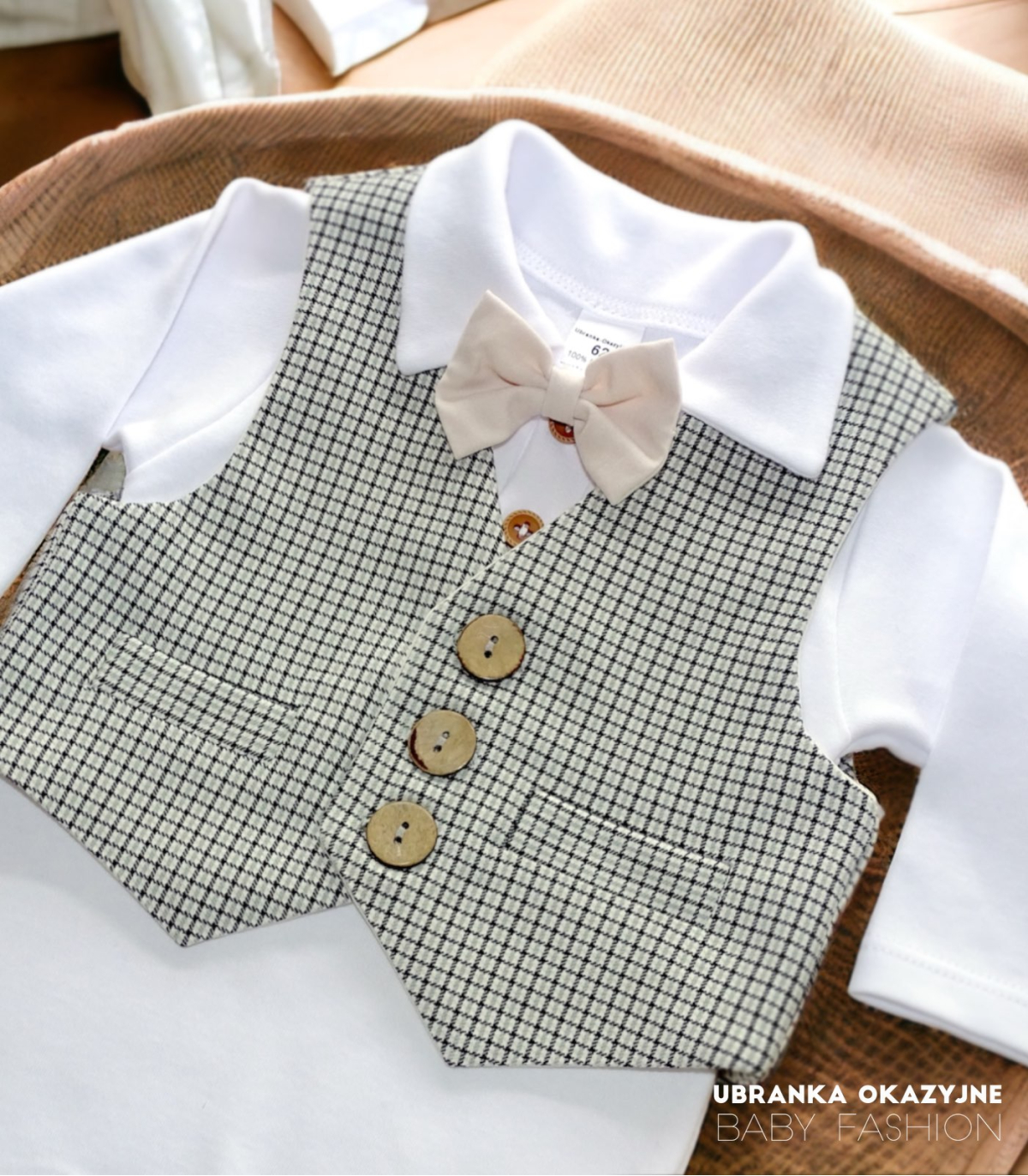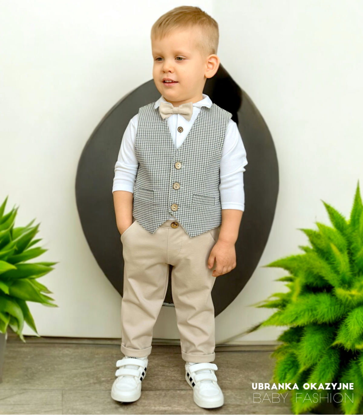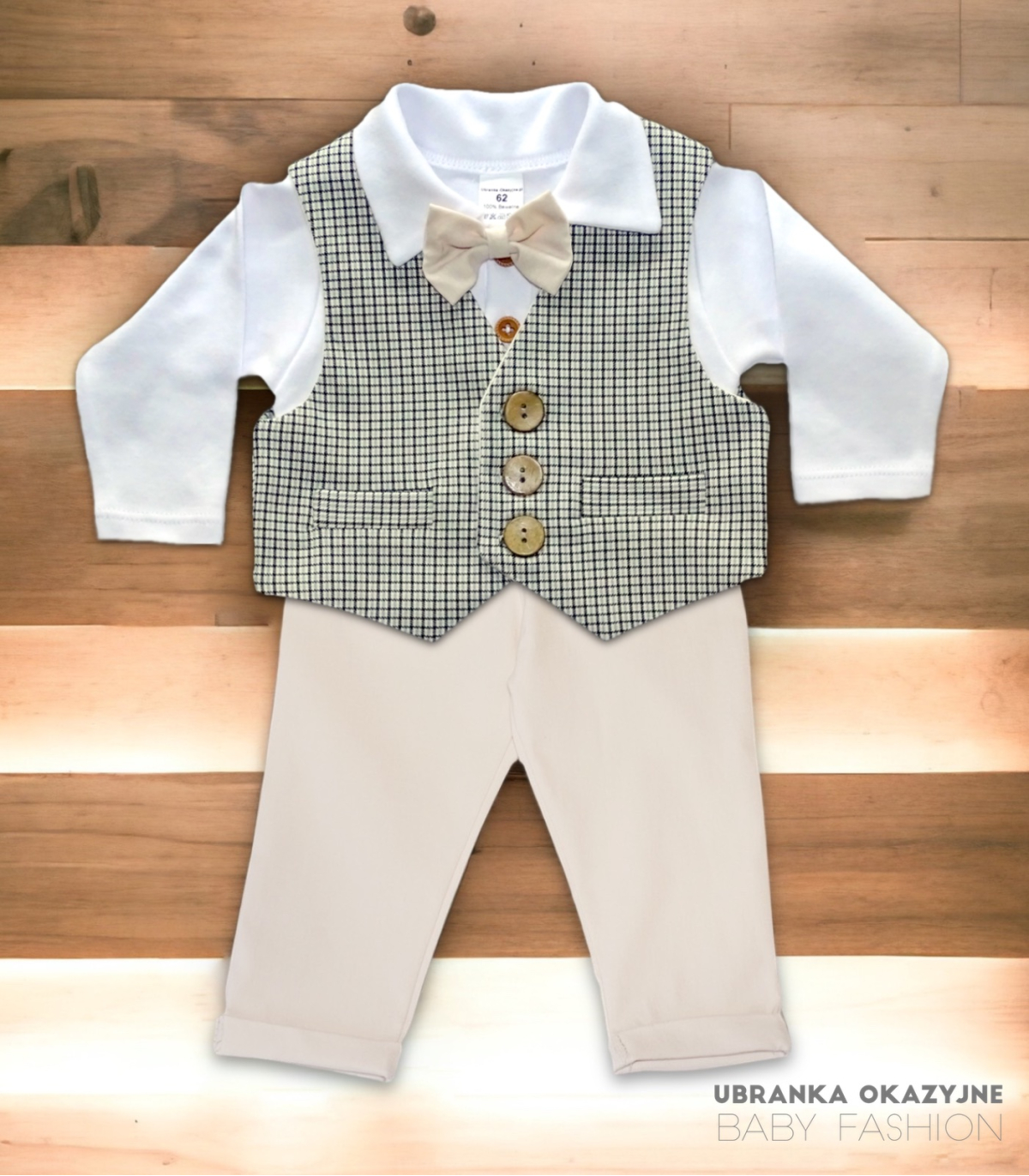 Odkryj nasze eleganckie ubranko dla niemowlaka lub małego dziecka, idealne na chrzest lub na imprezy okolicznościowe. Zestaw składa się z jasno-beżowych spodni z miękkiej i ciągliwej tkaniny, białego bawełnianego body z kołnierzykiem zapinanego na dwa brązowe guziczki, kamizelki w zieloną pepitkę oraz muszki wykonanej z tej samej tkaniny co spodnie. Dostępne rozmiary: 62, 68, 74, 80, 86. Podkreśl wyjątkowy charakter chrztu lub innych uroczystości - wybierz nasze urocze ubranko już dziś!