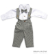 Zestaw dla małego stylowca to urokliwe spodnie na szelkach w zieloną pepitkę, białe bawełniane koszulo-body z długim rękawem zdobione drewnianymi guziczkami , sweterek z kolorze beżowym oraz elegancka mucha w tonacji spodni. Każda część tego zestawu jest starannie uszyta w Polsce, dbając o najwyższą jakość wykonania. Daj swojemu dziecku szansę na wyrażenie swego stylu w wygodnym, designerskim ubranku. Zestaw idealnie sprawdzi się jako ubranko do chrztu jak i na imprezy okolicznościowe. Dostępne rozmiary : 62 , 68 , 74 , 80 , 86.