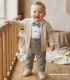 Spodnie na szelkach nie tylko dodają uroku, ale także zapewniają wygodę ruchu dla maluszka. Białe koszulo-body z drewnianymi guziczkami zapewniają elegancję i wygodę noszenia. Muszka idealnie komponuje się z kolorem spodni, dodając całości uroku i klasy. Beżowy sweterek nadaje całości wyjątkowego charakteru i podkreśla elegancję zestawu.