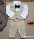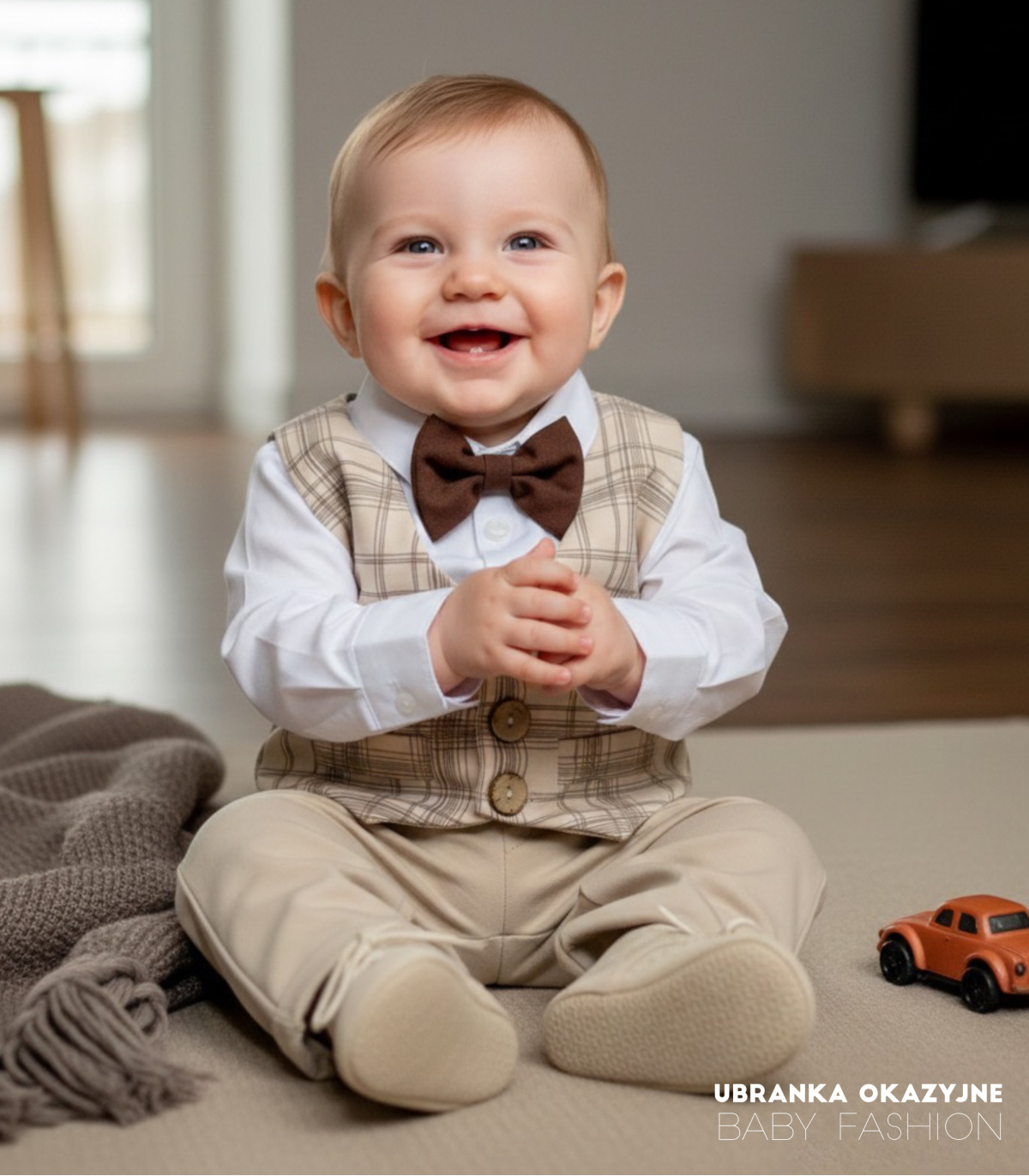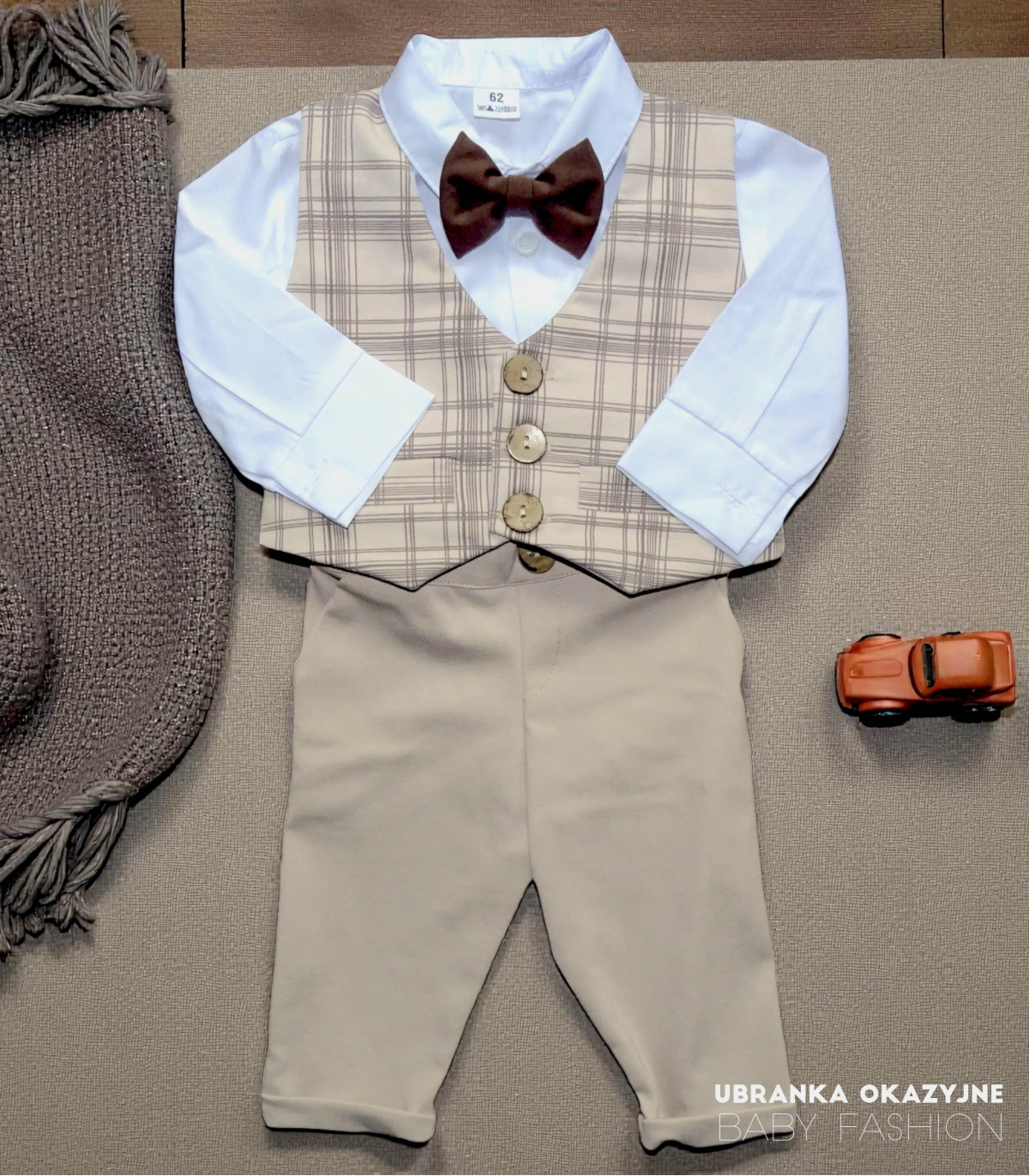 Odkryj nasze eleganckie ubranko dla niemowlaka lub małego dziecka, idealne na chrzest lub na imprezy okolicznościowe. Zestaw składa się z beżowych spodni z miękkiej i ciągliwej tkaniny, białego koszulo-body z kołnierzykiem, beżowej kamizelki w brązową kratkę oraz muszki w kolorze brązowym. Dostępne rozmiary: 62, 68, 74, 80, 86. Podkreśl wyjątkowy charakter chrztu lub innych uroczystości - wybierz nasze urocze ubranko już dziś!